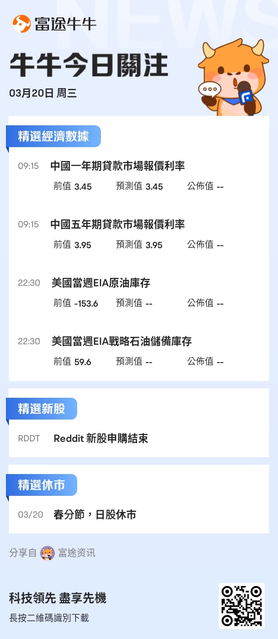 重磅新股方面,“美国版贴吧”$Reddit (RDDT.US)$将于今日在纽交所上市。