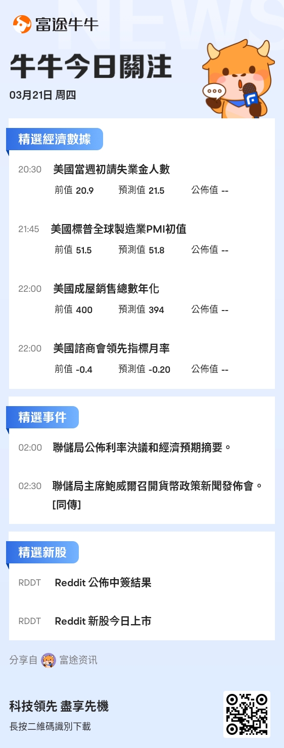 关键词:美联储公布利率决议、鲍威尔新闻发布会;初请失业金人数;中海油财报;Reddit上市