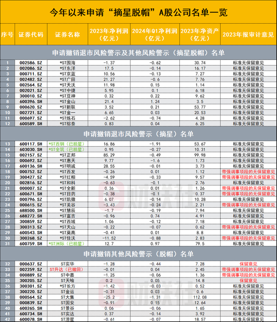 据财联社统计,截至5月11日发稿,今年以来共有超40家ST公司申请撤销退市风险警示及其他风险警示。其中。有12家*ST公司申请彻底“摘星脱帽”、19家公司申请撤销退市风险警示(摘星)、11家公司申请撤销其他风险警示(脱帽)。