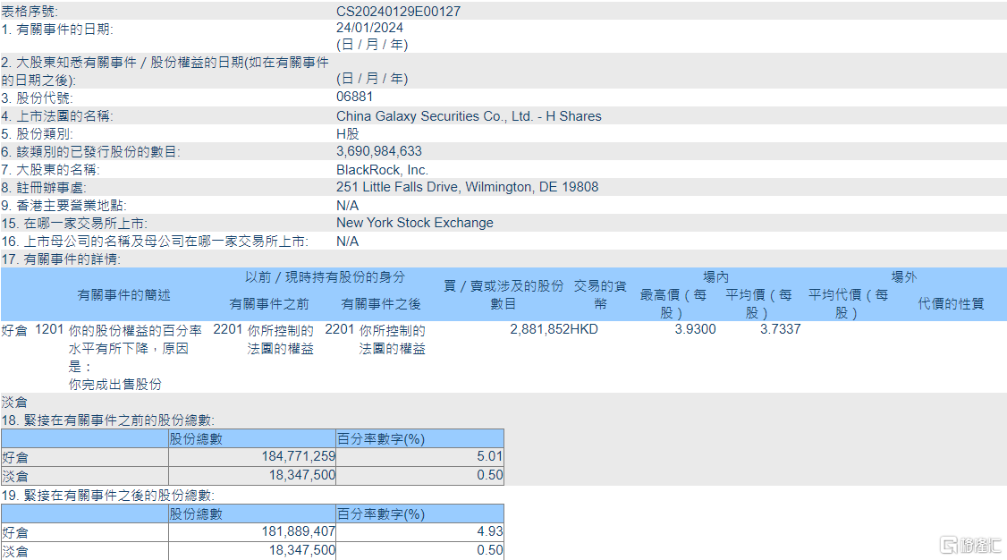 格隆汇1月30日丨根据联交所最新权益披露资料显示,2024年1月24日,中国银河(06881.HK)遭BlackRock, Inc.在场内以每股均价3.7337港元减持好仓288.19万股,涉资约1076万港元。