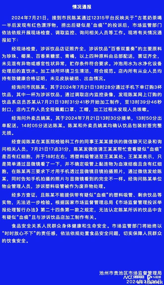 此前,有安徽的消费者陈女士在社交平台上发帖称,7月21日,其在池州市一家古茗门店购买的饮品中发现了红色漂浮物。该消费者表示,医院工作的同事通过显微镜观看后发现,这些漂浮物里面有大量红细胞。7月24日,#女子称古茗奶茶内疑有血痰#话题登上微博热搜榜。